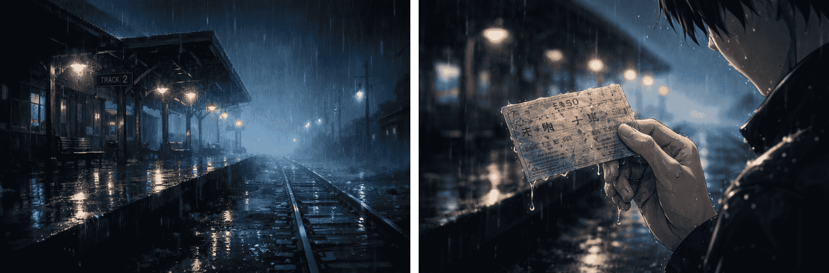 林野站在废弃车站的雨棚下,手里紧紧攥着一张已经被雨水打湿的火车票。站台的灯忽明忽暗,远处的铁轨在雨雾中若隐若现。