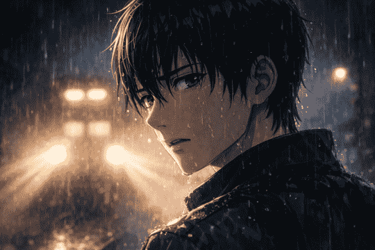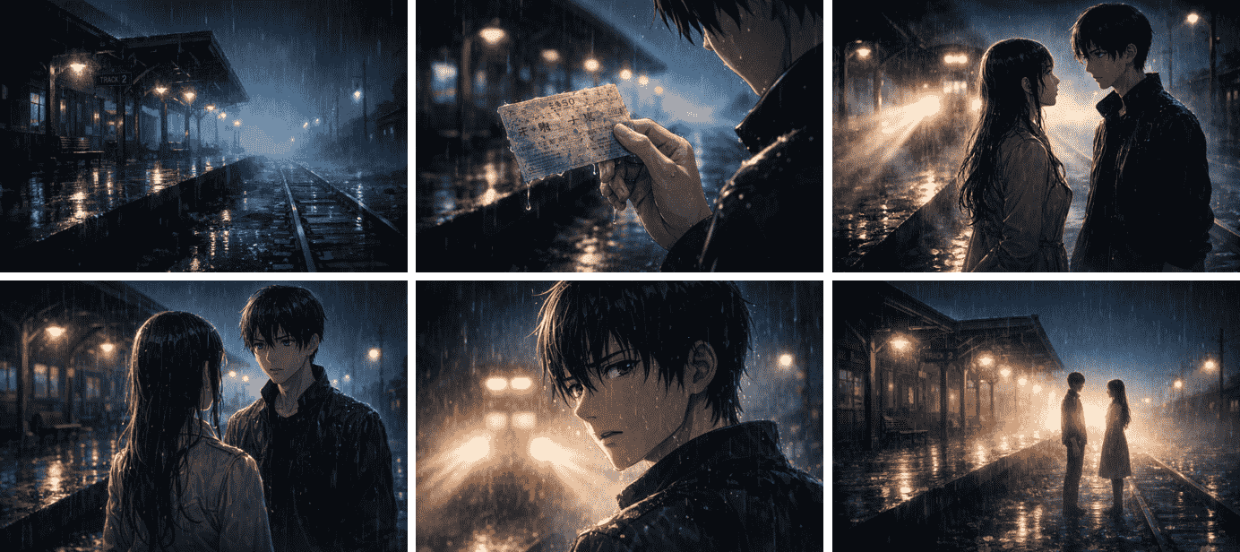 人物保持近景特写,雨水顺着脸颊滑落,人物停顿 0.5 秒后缓慢转头,背景列车灯光形成暖色虚化光斑,镜头轻微推近 1.5 秒,聚焦人物眼神变化,情绪由犹豫转为坚定。
